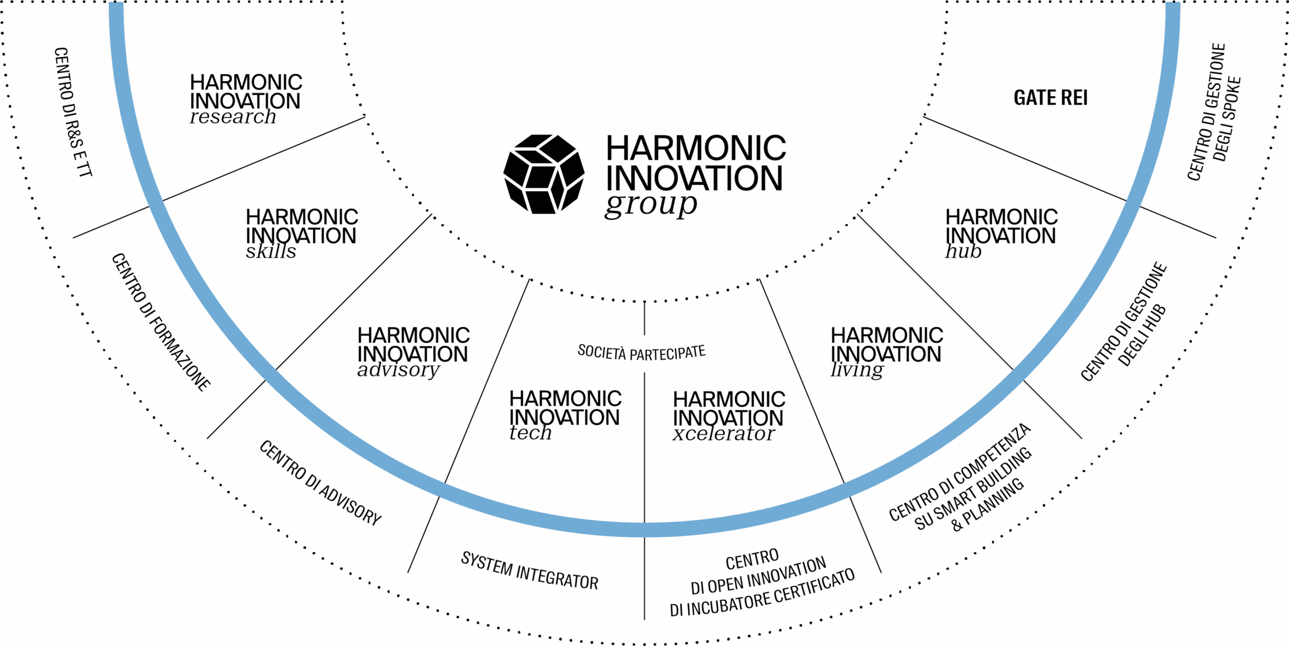 Harmonic Innovation Group è al centro di un ecosistema integrato di società operative, specializzate in funzioni strategiche e complementari per la realizzazione della filiera integrata dell’innovazione e per l’implementazione di Harmonic Innovation Ecosystem.