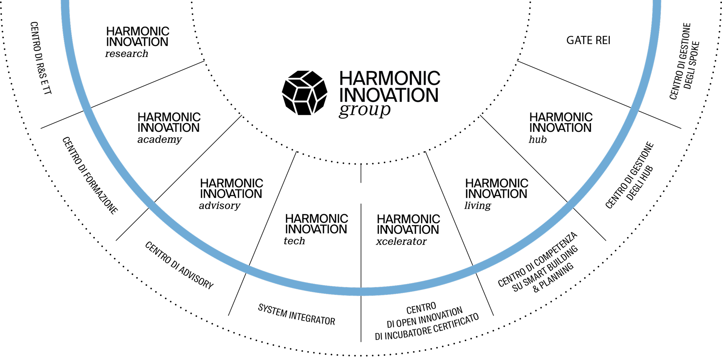 Harmonic Innovation Group è al centro di un ecosistema integrato di società operative, specializzate in funzioni strategiche e complementari per la realizzazione della filiera integrata dell’innovazione e per l’implementazione di Harmonic Innovation Ecosystem.